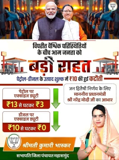 पेट्रोल-डीज़ल पर एक्साइज ड्यूटी में बड़ी कटौती, केंद्र के फैसले का श्रीमती भास्कर ने किया स्वागत
