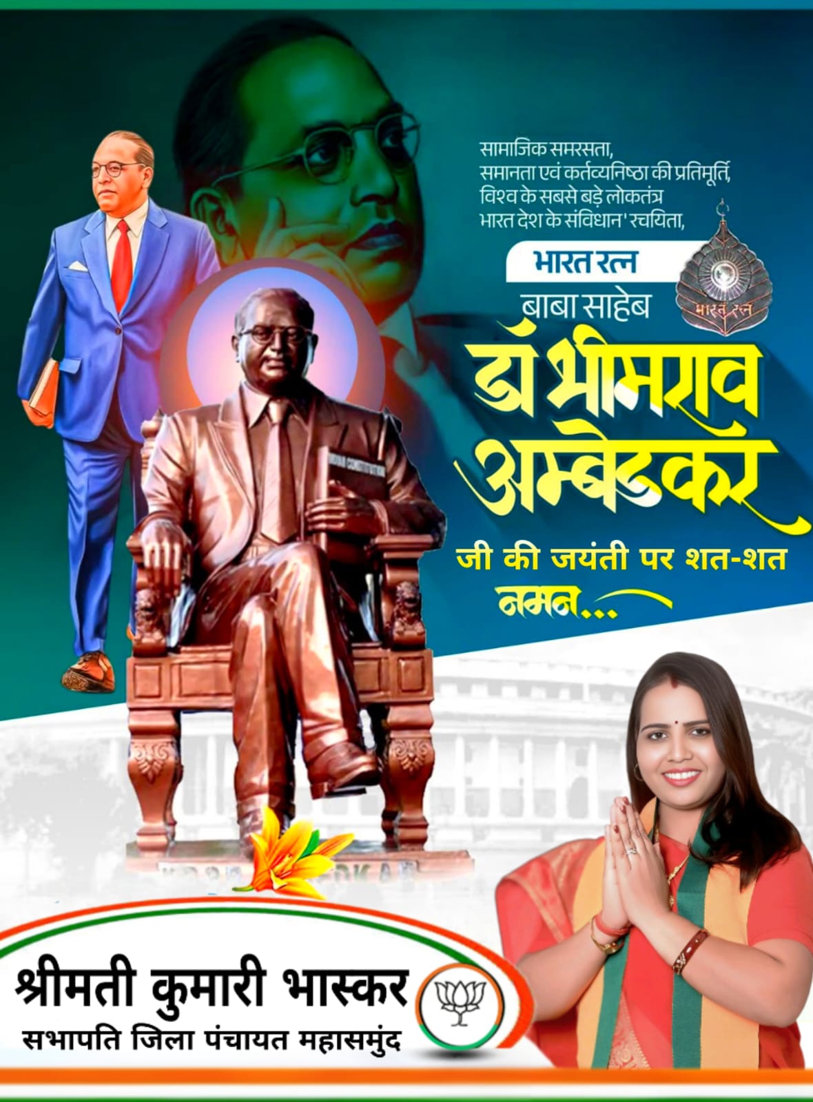महासमुंद /सरायपाली :- 14 अप्रैल 2026 डॉ. भीमराव अंबेडकर की 135वीं जयंती जयंती बड़े सम्मान और उत्साह के साथ मनाई जा रही है। डॉ. भीमराव अंबेडकर जयंती पर श्रीमती कुमारी भास्कर सभापति जिला पंचायत महासमुंद ने प्रतिमा पर पुष्पांजलि अर्पित की और उनके विचारों और योगदान को याद की।